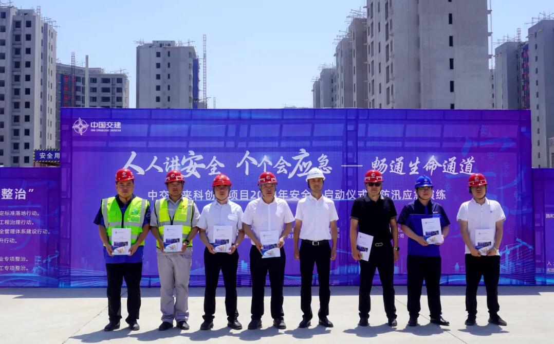 中交未来科创城项目成功举办“安全生产月”启动仪式暨防汛应急演练。活动中,项目公司有关负责人宣讲了安全课,安监部分析报告了项目现场安全质量环保问题,进一步强调安全生产要求,明确安全防范措施。组织各标段参建单位联合开展应急演练,发放安全应急指导手册,切实增强项目现场管理人员安全生产意识,提升应急处置能力。